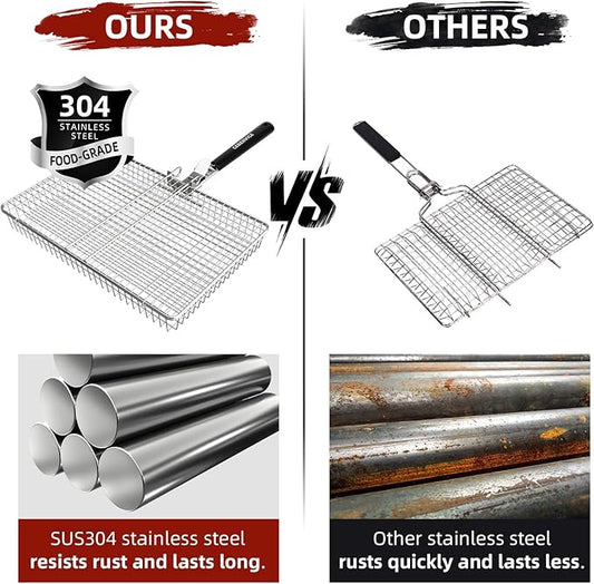 Grill Basket Extra Large, SUS304 Stainless Steel, Portable Folding BBQ Camping Grilling Rack for Fish, Vegetables, Shrimp, Barbeque Griller Cooking Accessories